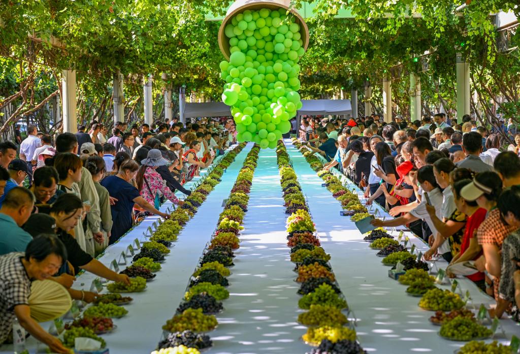 人们在吐鲁番特色葡萄集市上品尝葡萄(2024年8月17日摄)。新华社记者 陈朔 摄